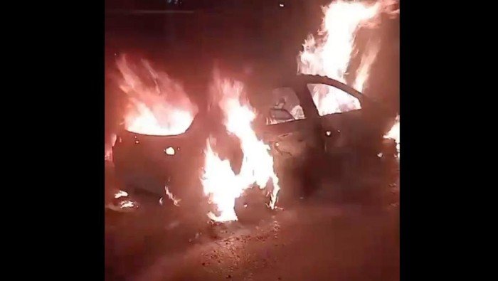 Momen ini dibagikan di postingan X @TMCPoldaMetro, Kamis (13/11/2025). Terlihat mobil itu terbakar di hampir seluruh bagian.